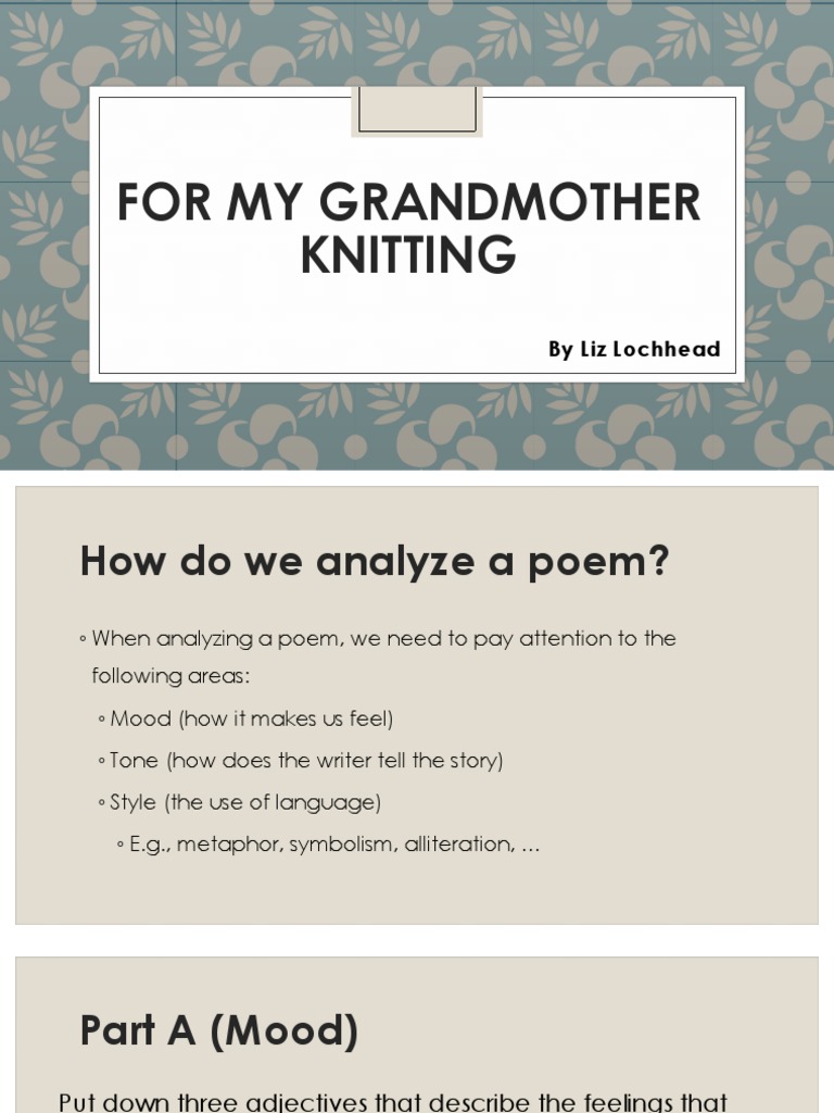 For My Grandmother Knitting Song Structure Poetry from imgv2-1-f.scribdassets.com Just as a grandmother has done for all her children and grandchildren. Grandma's heart is a beautiful poem… Select from a pink, blue or yellow ribbon. May this shawl be a reminder of a safe and secure hug, and that a grandmother's love is sustaining, just like the love from the lord. Grandmother's prayer* may god's grace be upon this shawl…. Within this subgenre, there are several motifs, including what is colloquially referred to as "the sweater curse": By the way, this poem started our company, so i am a little biased in my affections:) our 5x7 grandma card with grandma's heart poem comes with a sheer ribbon and a white envelope. The idea that when someone knits a garment for their love interest, the act will seal the demise of their relationship.